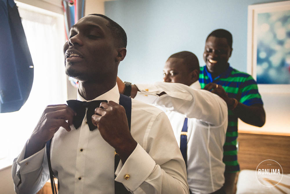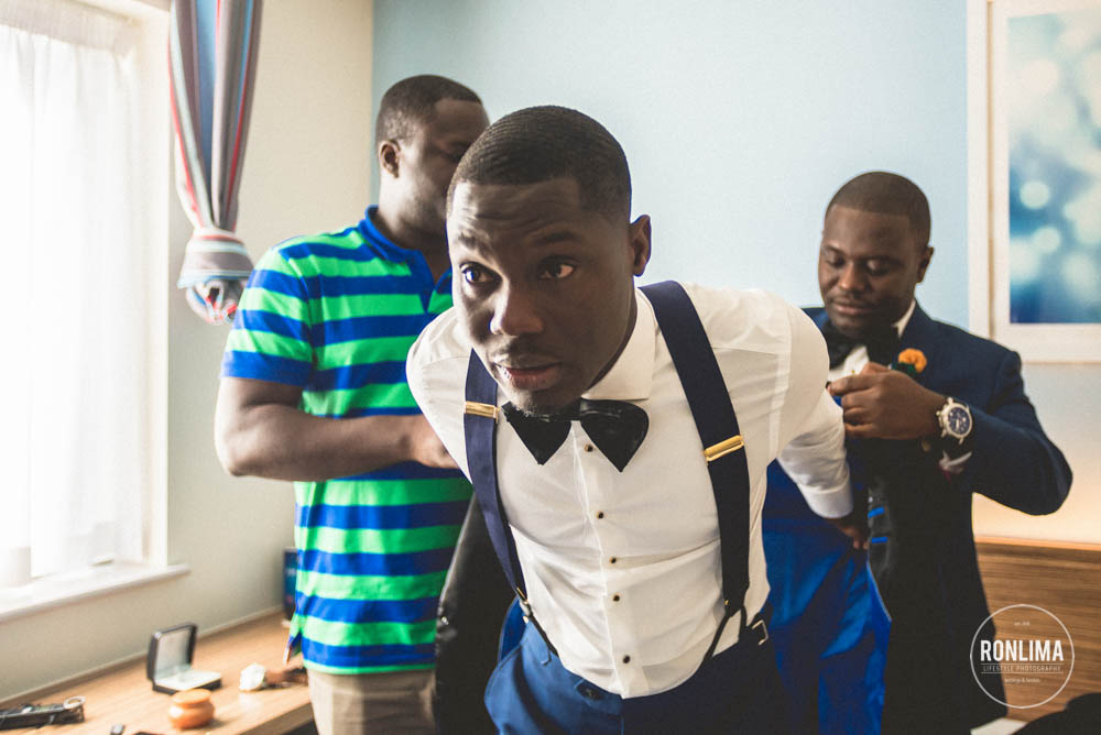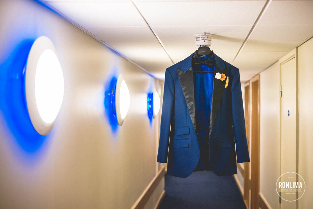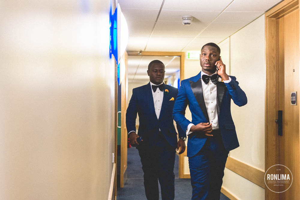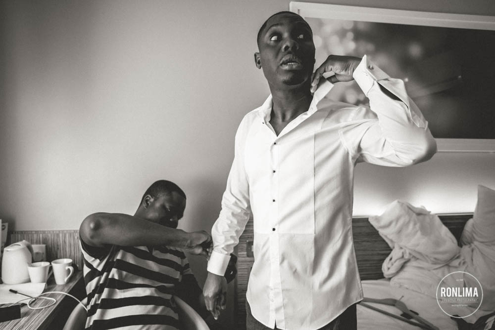 Começamos o dia fotografando os noivos e os padrinhos em um hotel próximo a estação de Vauxhall, em Londres. Eles reservaram vários quartos em 2 andares do hotel – um andar para o noivo e padrinhos e outro para a noiva e madrinhas – ali já começou a festa! Muita música e risada entre um quarto e outro.